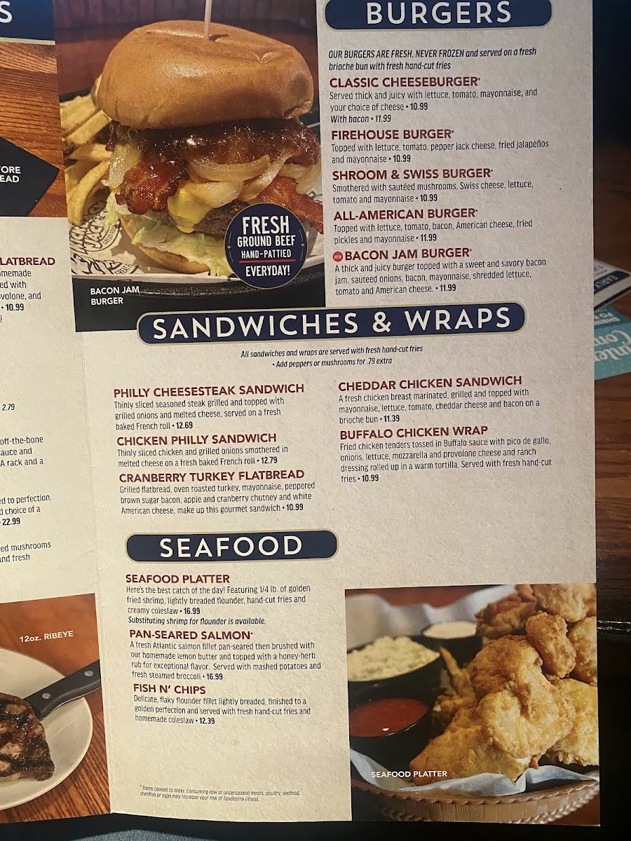 Highlights of the menu include the Bacon Jam Burger, featuring a delightful blend of savory toppings that create a rich taste explosion, and the spicy homemade chili, perfect for those craving comfort food. Don't miss the fresh hand-cut fries and seasoned green beans to complement your meal.